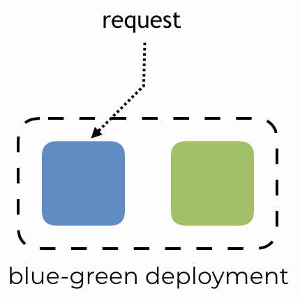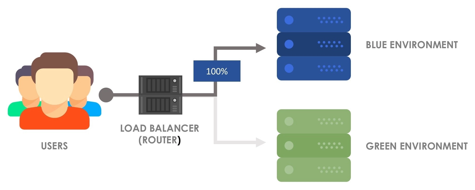 При сине-зеленом развертывании весь клиентский трафик одномоментно перераспределяется с одного бэкенда на другой. Эта схема позволяет сначала протестировать на зеленом стенде, только потом перераспределить трафик с синего.