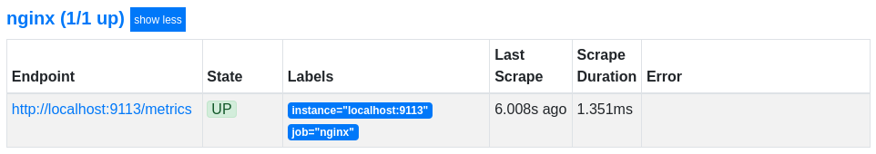 - targets: ['localhost:9113']Можно теперь проверить targets в браузере: http://localhost:9090/classic/targets