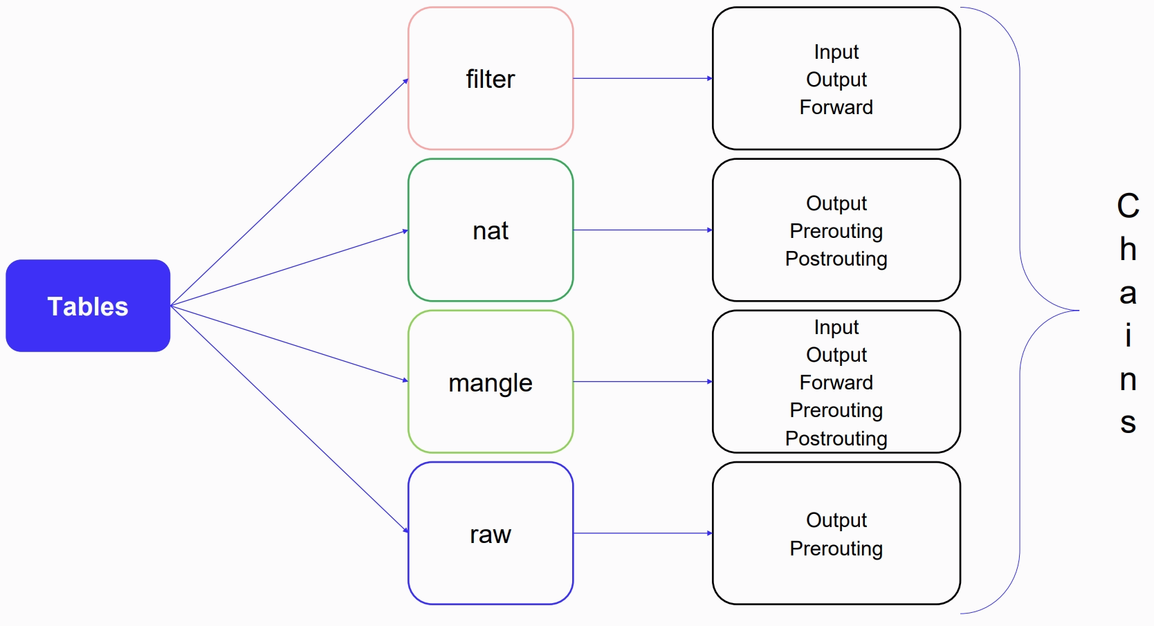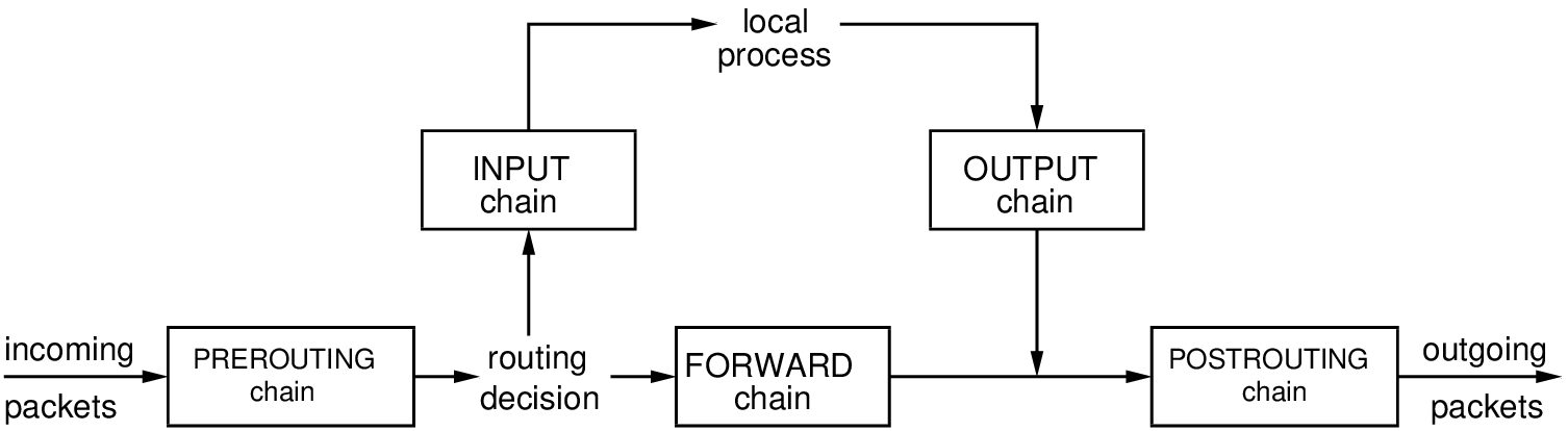 Цепочки iptables (последовательности правил, которые применяются к пакетам):