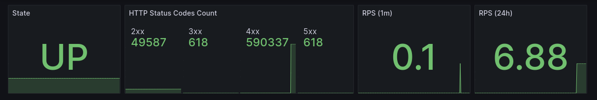 RPS / RPS за 24H rate(nginx_http_requests_total[1m]) sum(rate(nginx_http_requests_total[24h]))