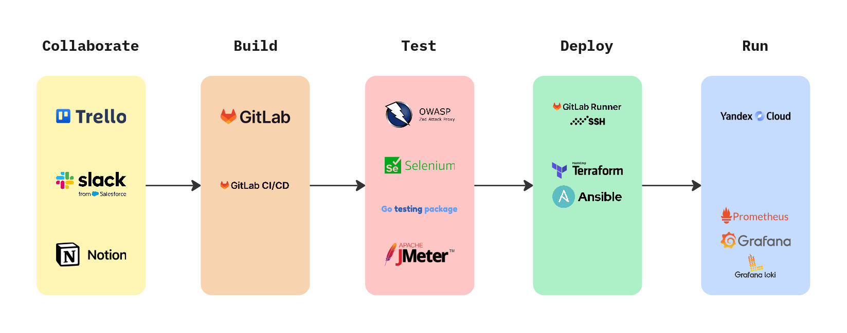 Для каждого из доменов (Collaboration, Build, Test, Deploy, Run) подберите пул инструментов, которые вы внедрили бы у себя в компании при необходимости.