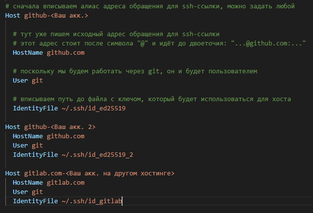 - IdentityFile - путь до SSH-ключа, привязанного к аккаунту с соответствующим Host.